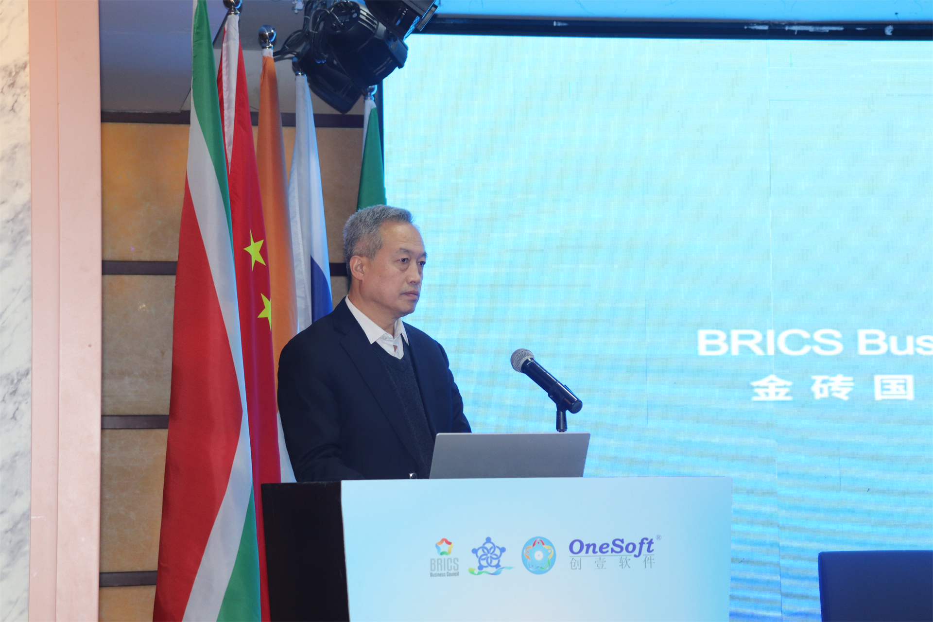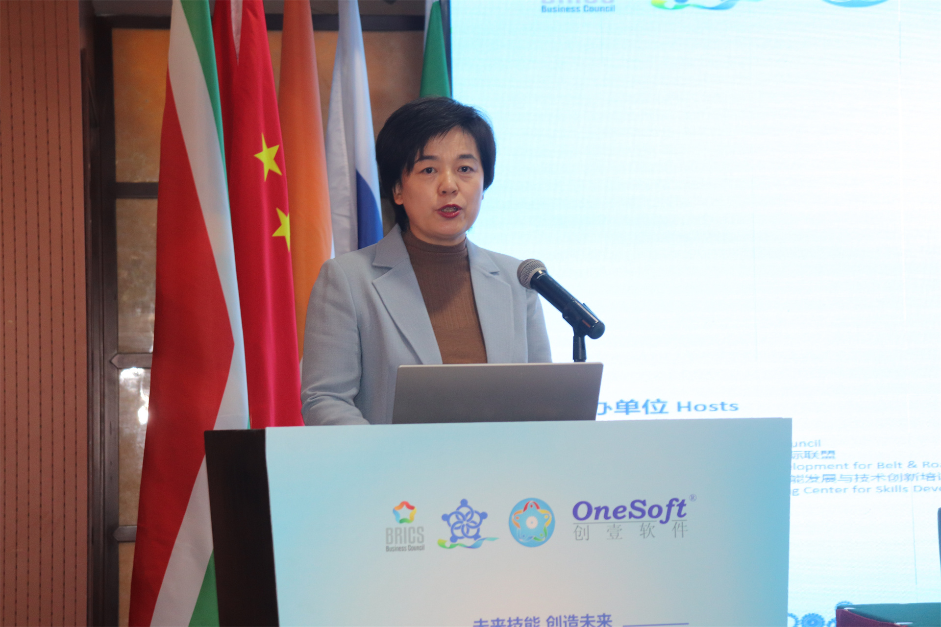 ▲金磚國(guó)家工商理事會(huì)(中方)技能發(fā)展工作組組長(zhǎng)、金磚國(guó)家技能發(fā)展與技術(shù)創(chuàng)新大賽組委會(huì)執(zhí)委會(huì)主席劉振英視頻致辭