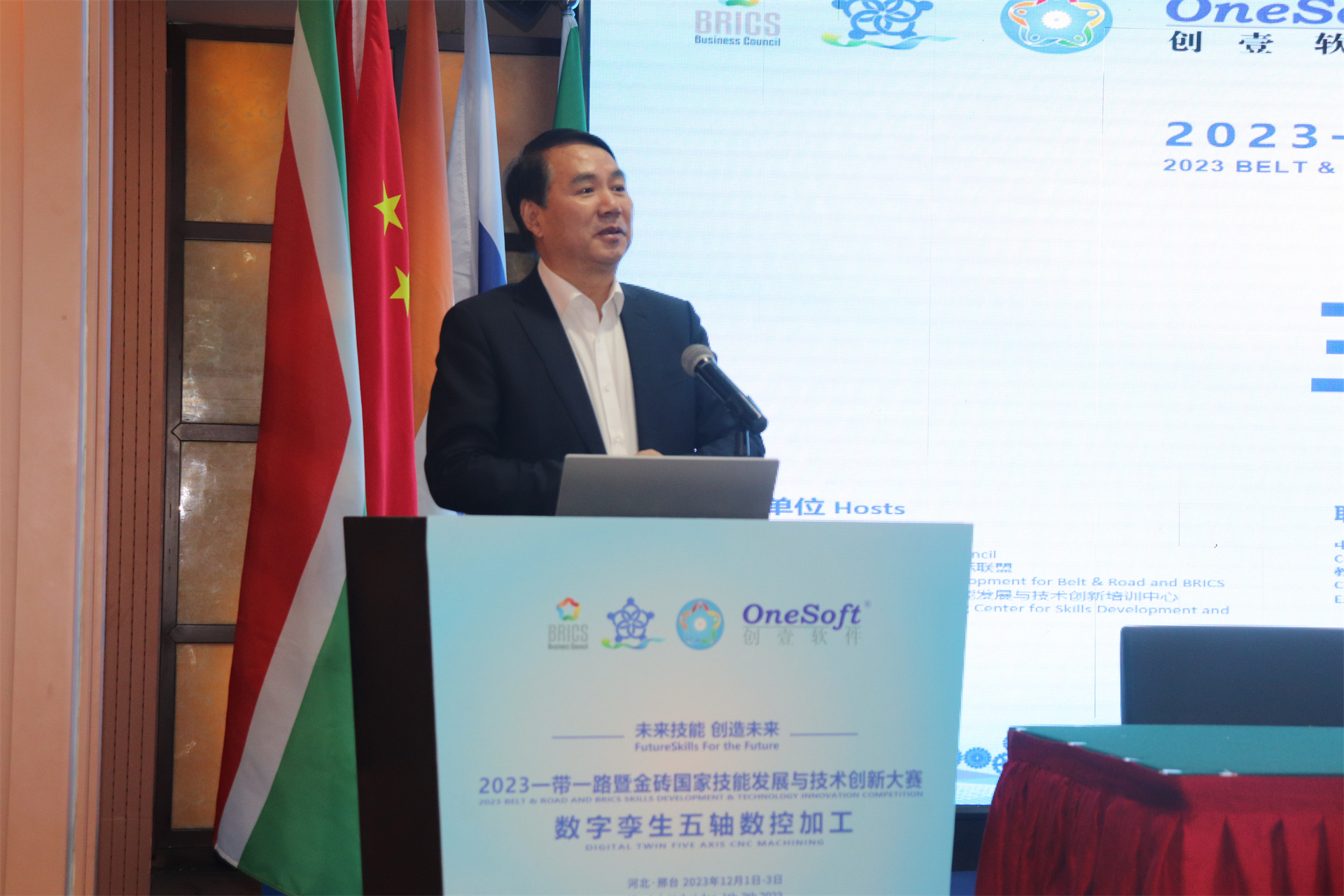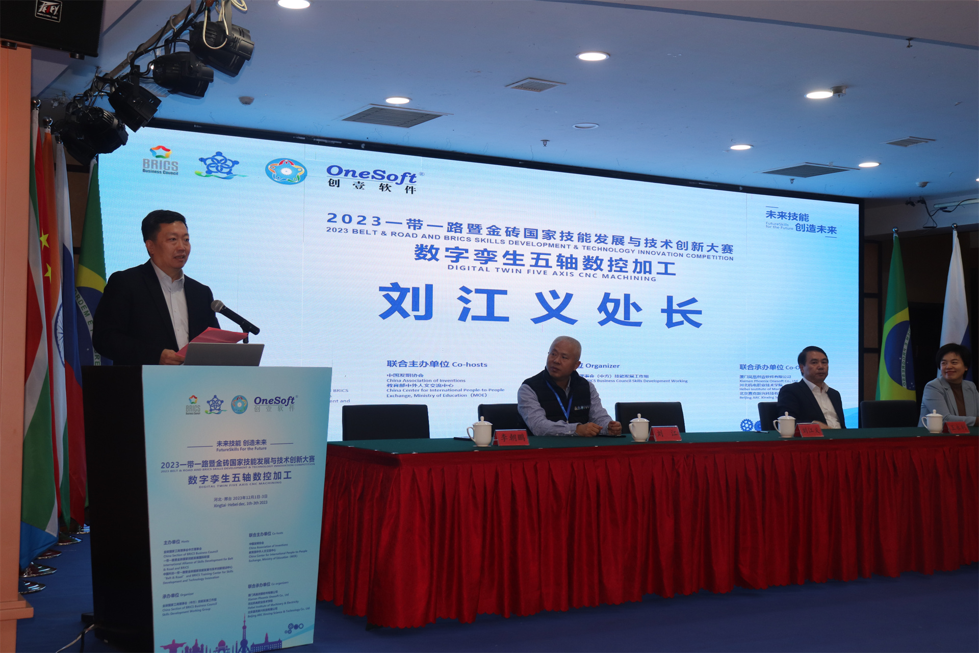 12月1日,2023一帶一路暨金磚國(guó)家技能發(fā)展與技術(shù)創(chuàng)新大賽數(shù)字孿生五軸數(shù)控加工賽項(xiàng)國(guó)內(nèi)決賽開(kāi)幕式在萬(wàn)峰大酒店舉行,由河北機(jī)電職業(yè)技術(shù)學(xué)院副院長(zhǎng)李朝鵬主持。金磚國(guó)家工商理事會(huì)(中方)技能發(fā)展工作組組長(zhǎng)、金磚國(guó)家技能發(fā)展與技術(shù)創(chuàng)新大賽組委會(huì)執(zhí)委會(huì)主席劉振英視頻致辭,中國(guó)教育國(guó)際交流協(xié)會(huì)副會(huì)長(zhǎng),前秘書(shū)長(zhǎng)王永利、金磚國(guó)家技能發(fā)展與技術(shù)創(chuàng)新大賽組委會(huì)副主任何美連,河北省教育廳國(guó)際處劉江義處長(zhǎng)、河北機(jī)電職業(yè)技術(shù)學(xué)院院長(zhǎng)王曉鳳、廈門(mén)鳳凰創(chuàng)壹軟件有限公司運(yùn)營(yíng)總監(jiān)陳海寧等領(lǐng)導(dǎo)受邀出席并致辭。河北機(jī)電職業(yè)技術(shù)學(xué)院繼續(xù)教育部主任李成革、廈門(mén)鳳凰創(chuàng)壹軟件有限公司高級(jí)總監(jiān)江蕓梅等領(lǐng)導(dǎo)出席開(kāi)幕式,仲裁長(zhǎng)、總裁判長(zhǎng)及裁判組成員、行業(yè)專家、參賽院校領(lǐng)隊(duì)、指導(dǎo)老師、參賽選手等近百人參加了開(kāi)幕式。