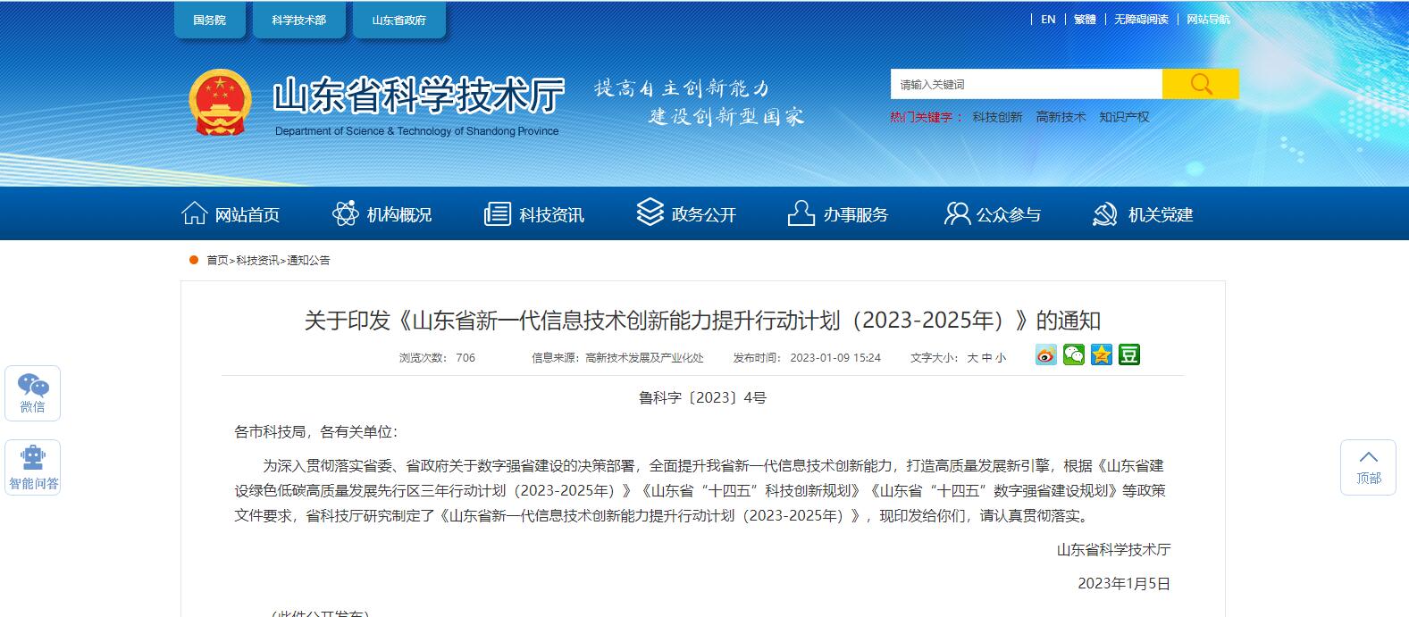 為深入貫徹落實(shí)省委、省政府關(guān)于數(shù)字強(qiáng)省建設(shè)的決策部署,全面提升我省新一代信息技術(shù)創(chuàng)新能力,打造高質(zhì)量發(fā)展新引擎,根據(jù)《山東省建設(shè)綠色低碳高質(zhì)量發(fā)展先行區(qū)三年行動(dòng)計(jì)劃(2023-2025年)》《山東省“十四五”科技創(chuàng)新規(guī)劃》《山東省“十四五”數(shù)字強(qiáng)省建設(shè)規(guī)劃》等政策文件要求,省科技廳研究制定了《山東省新一代信息技術(shù)創(chuàng)新能力提升行動(dòng)計(jì)劃(2023-2025年)》,現(xiàn)印發(fā)給你們,請(qǐng)認(rèn)真貫徹落實(shí)。