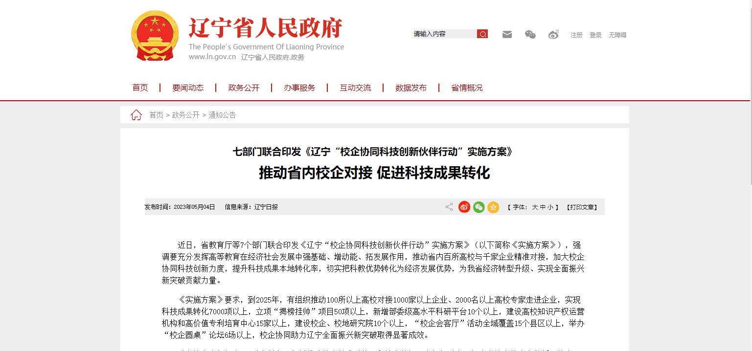 近日,遼寧省教育廳等7個部門聯(lián)合印發(fā)《遼寧“校企協(xié)同科技創(chuàng)新伙伴行動”實施方案》(以下簡稱《實施方案》),強調(diào)要充分發(fā)揮高等教育在經(jīng)濟社會發(fā)展中強基礎、增動能、拓發(fā)展作用,推動百所高校與千家企業(yè)精準對接,加大校企協(xié)同科技創(chuàng)新力度,提升科技成果本地轉(zhuǎn)化率,切實把科教優(yōu)勢轉(zhuǎn)化為經(jīng)濟發(fā)展優(yōu)勢,為我省經(jīng)濟轉(zhuǎn)型升級、實現(xiàn)全面振興新突破貢獻力量。