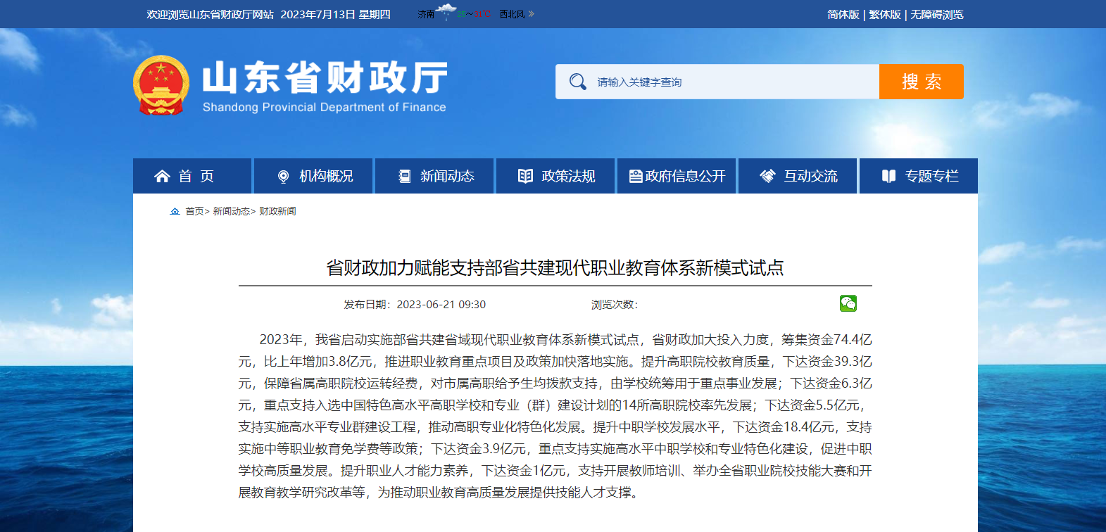 山東省財政廳官網(wǎng)發(fā)布,2023年,山東省啟動實施部省共建省域現(xiàn)代職業(yè)教育體系新模式試點,省財政加大投入力度,籌集資金74.4億元,比上年增加3.8億元,推進職業(yè)教育重點項目及政策加快落地實施。提升高職院校教育質(zhì)量,下達資金39.3億元,保障省屬高職院校運轉(zhuǎn)經(jīng)費,對市屬高職給予生均撥款支持,由學校統(tǒng)籌用于重點事業(yè)發(fā)展;下達資金6.3億元,重點支持入選中國特色高水平高職學校和專業(yè)(群)建設(shè)計劃的14所高職院校率先發(fā)展;下達資金5.5億元,支持實施高水平專業(yè)群建設(shè)工程,推動高職專業(yè)化特色化發(fā)展。提升中職學校發(fā)展水平,下達資金18.4億元,支持實施中等職業(yè)教育免學費等政策;下達資金3.9億元,重點支持實施高水平中職學校和專業(yè)特色化建設(shè),促進中職學校高質(zhì)量發(fā)展。提升職業(yè)人才能力素養(yǎng),下達資金1億元,支持開展教師培訓、舉辦全省職業(yè)院校技能大賽和開展教育教學研究改革等,為推動職業(yè)教育高質(zhì)量發(fā)展提供技能人才支撐。