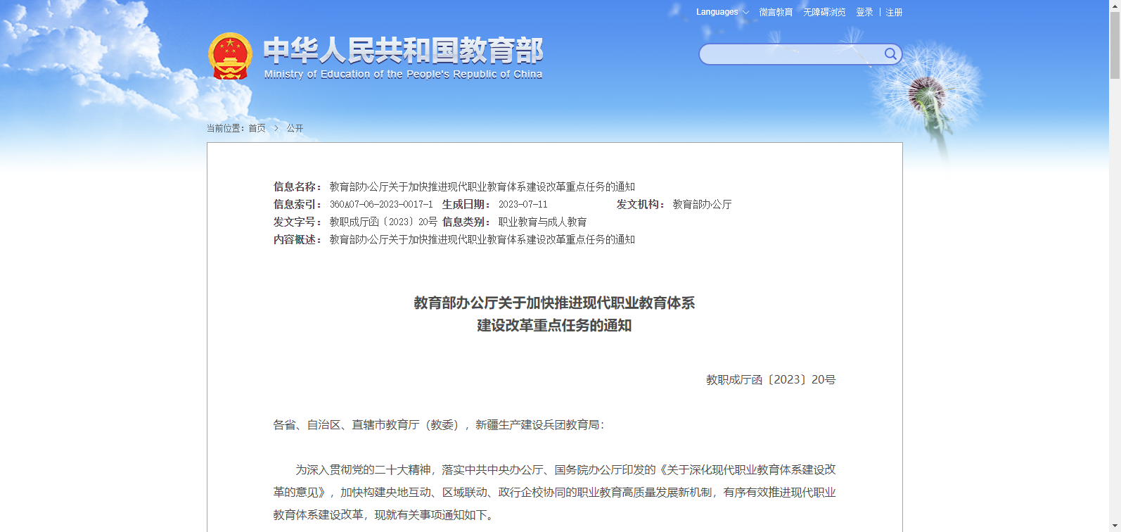 為深入貫徹黨的二十大精神,落實中共中央辦公廳、國務(wù)院辦公廳印發(fā)的《關(guān)于深化現(xiàn)代職業(yè)教育體系建設(shè)改革的意見》,加快構(gòu)建央地互動、區(qū)域聯(lián)動、政行企校協(xié)同的職業(yè)教育高質(zhì)量發(fā)展新機制,有序有效推進現(xiàn)代職業(yè)教育體系建設(shè)改革,現(xiàn)就有關(guān)事項通知如下。