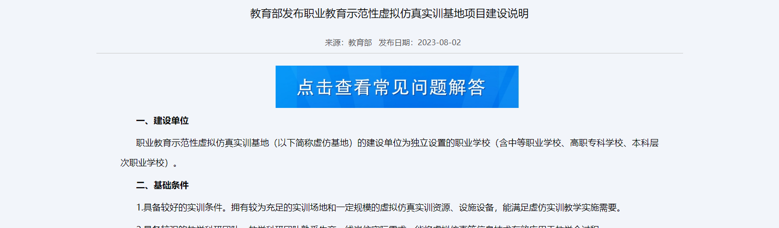 職業(yè)教育示范性虛擬仿真實訓(xùn)基地(以下簡稱虛仿基地)的建設(shè)單位為獨立設(shè)置的職業(yè)學(xué)校(含中等職業(yè)學(xué)校、高職??茖W(xué)校、本科層次職業(yè)學(xué)校)。