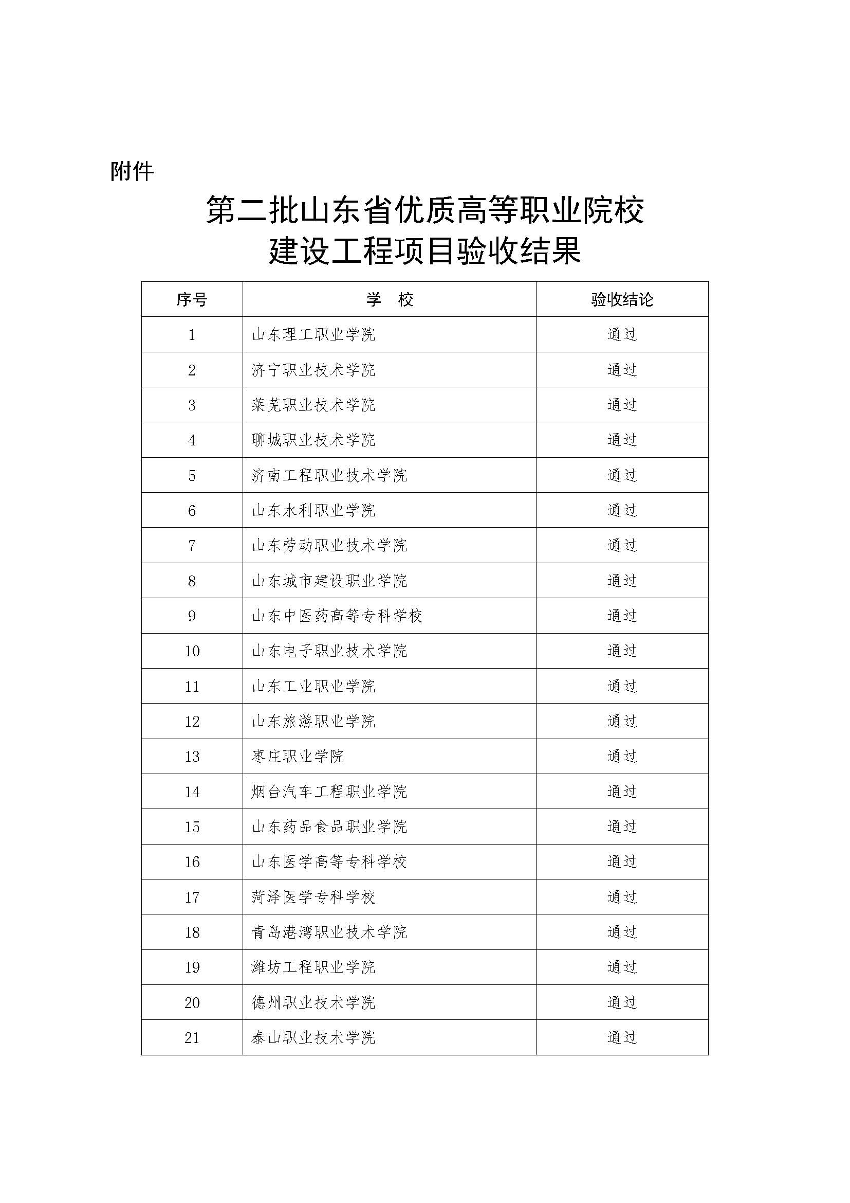 根據(jù)山東省優(yōu)質(zhì)高等職業(yè)院校建設(shè)工程實施管理規(guī)定,在學(xué)校自評、項目審計基礎(chǔ)上,我廳組織專家采取現(xiàn)場評估方式,對第二批立項建設(shè)的省優(yōu)質(zhì)高職院校進行了驗收。按照《山東省教育廳 山東省財政廳關(guān)于實施山東省優(yōu)質(zhì)高等職業(yè)院校建設(shè)工程的通知》(魯教職字〔2017〕4號)相關(guān)規(guī)定,依據(jù)專家驗收結(jié)果,21所立項建設(shè)的第二批省優(yōu)質(zhì)高職院校全部驗收通過,授予“山東省優(yōu)質(zhì)高等職業(yè)院校”稱號。驗收結(jié)果經(jīng)公示無異議,現(xiàn)予以公布(見附件)。