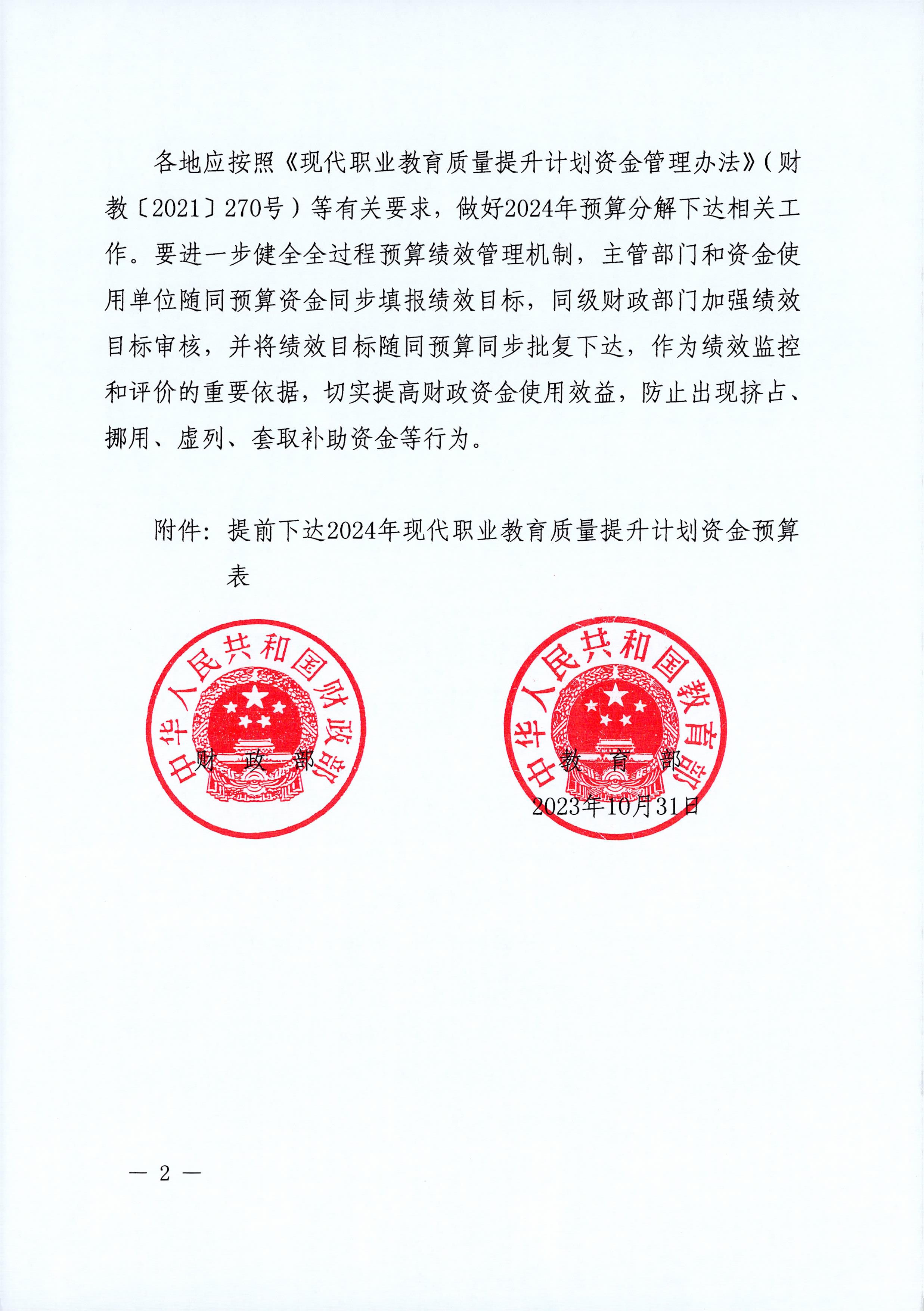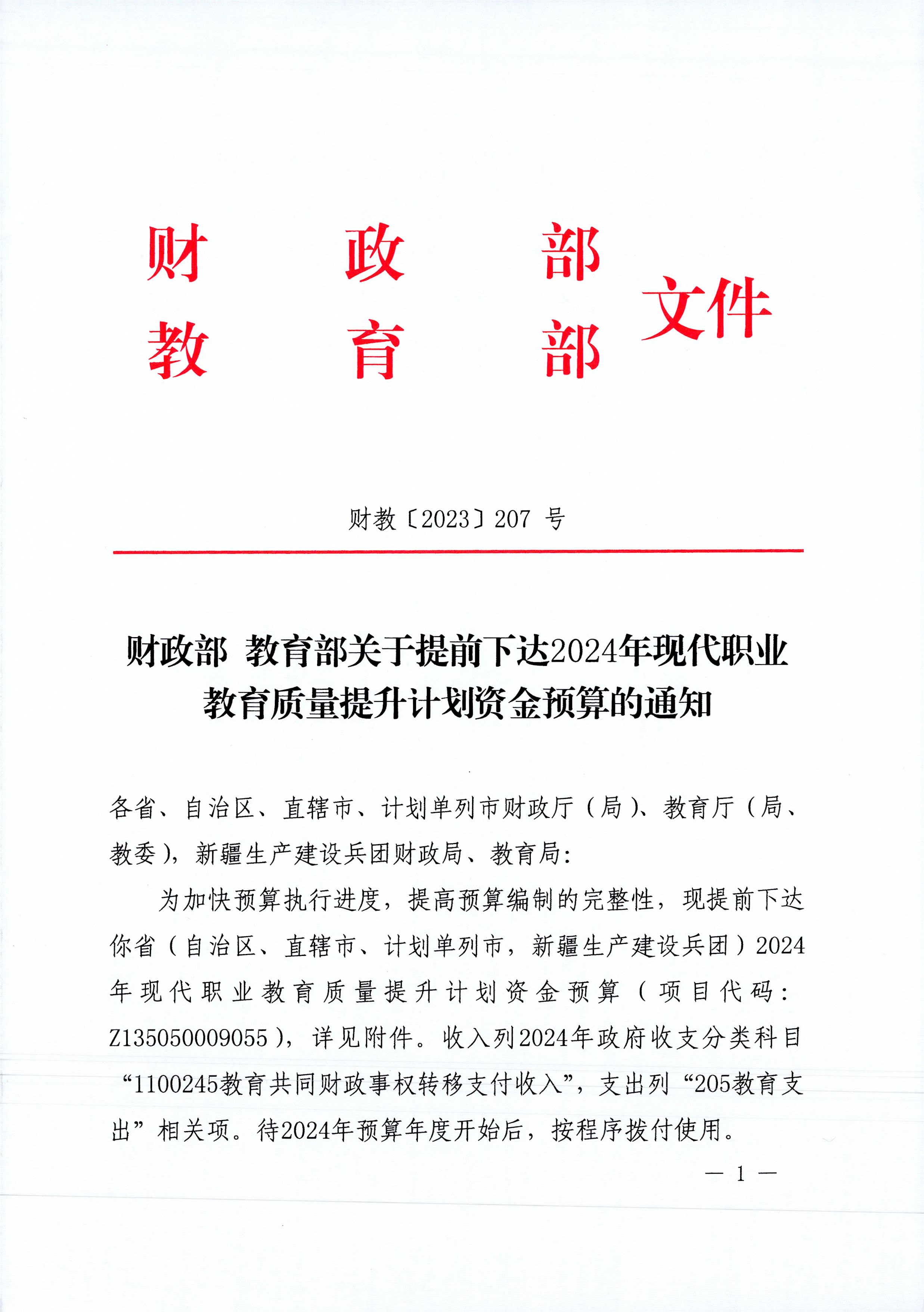 近日,財政部、教育部發(fā)布《提前下達2024年現(xiàn)代職業(yè)教育質(zhì)量提升計劃資金預算的通知》