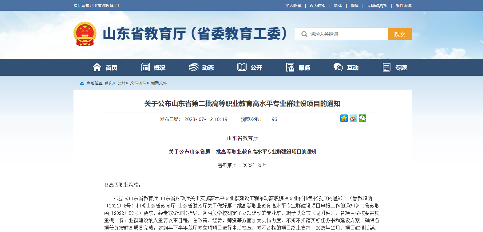 近日,山東省教育廳在其官網(wǎng)發(fā)布關(guān)于《關(guān)于公布山東省第二批高等職業(yè)教育高水平專業(yè)群建設(shè)項(xiàng)目的通知》,根據(jù)《山東省教育廳 山東省財政廳關(guān)于實(shí)施高水平專業(yè)群建設(shè)工程推動高職院校專業(yè)化特色化發(fā)展的通知》(魯教......