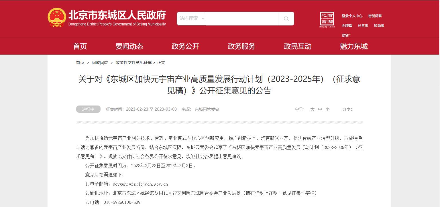 北京市東城區(qū)發(fā)布《東城區(qū)加快元宇宙產(chǎn)業(yè)高質量發(fā)展行動計劃(2023-2025年)(征求意見稿)