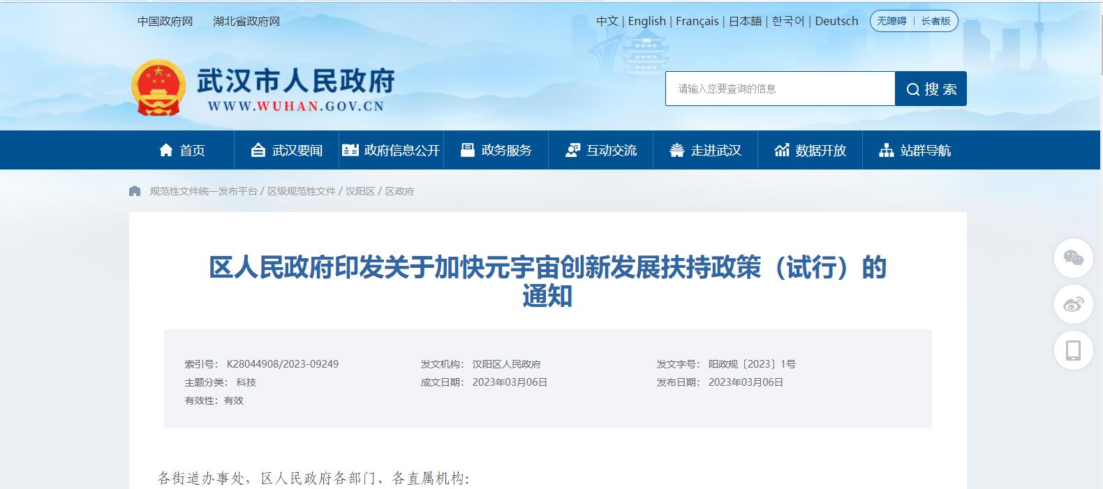 武漢發(fā)布《漢陽區(qū)關于加快元宇宙創(chuàng)新發(fā)展扶持政策(試行)》