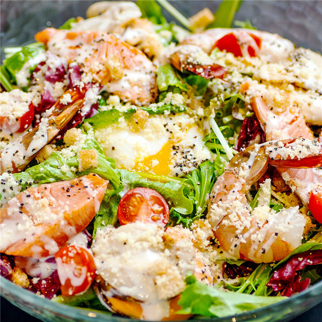 沙拉并不只是一堆冷冰冰的蔬菜,還可以包括各種高蛋白的肉類,以及面包丁、通心粉等主食。凱撒沙拉就是其中著名的一種,傳統(tǒng)風味中除了蔬菜、肉類和奶酪外,還配有煎烤過的面包丁以提供飽腹感。 ......